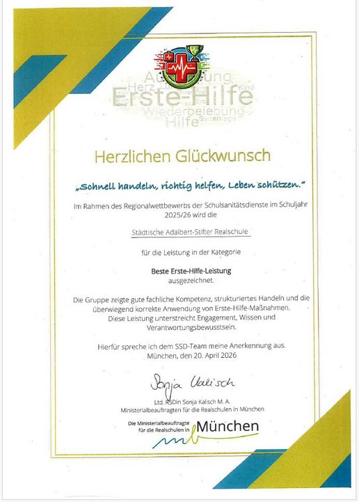 Unser Schulsanitätsteam der ASR (unter der Leitung von Fr. Dreyer) nahm am Montag, den 20.04.2026 am Wettbewerb der Schulsanitätsdienste an der Realschulschule Unterschleißheim teil. Dabei zeigten sie u.a. in Fallbeispielen, Reanimationstechniken, Theorie und Teamwork-Aufgaben ihr Können. Wir gratulieren unserem Team ganz herzlich für ihre Leistung!